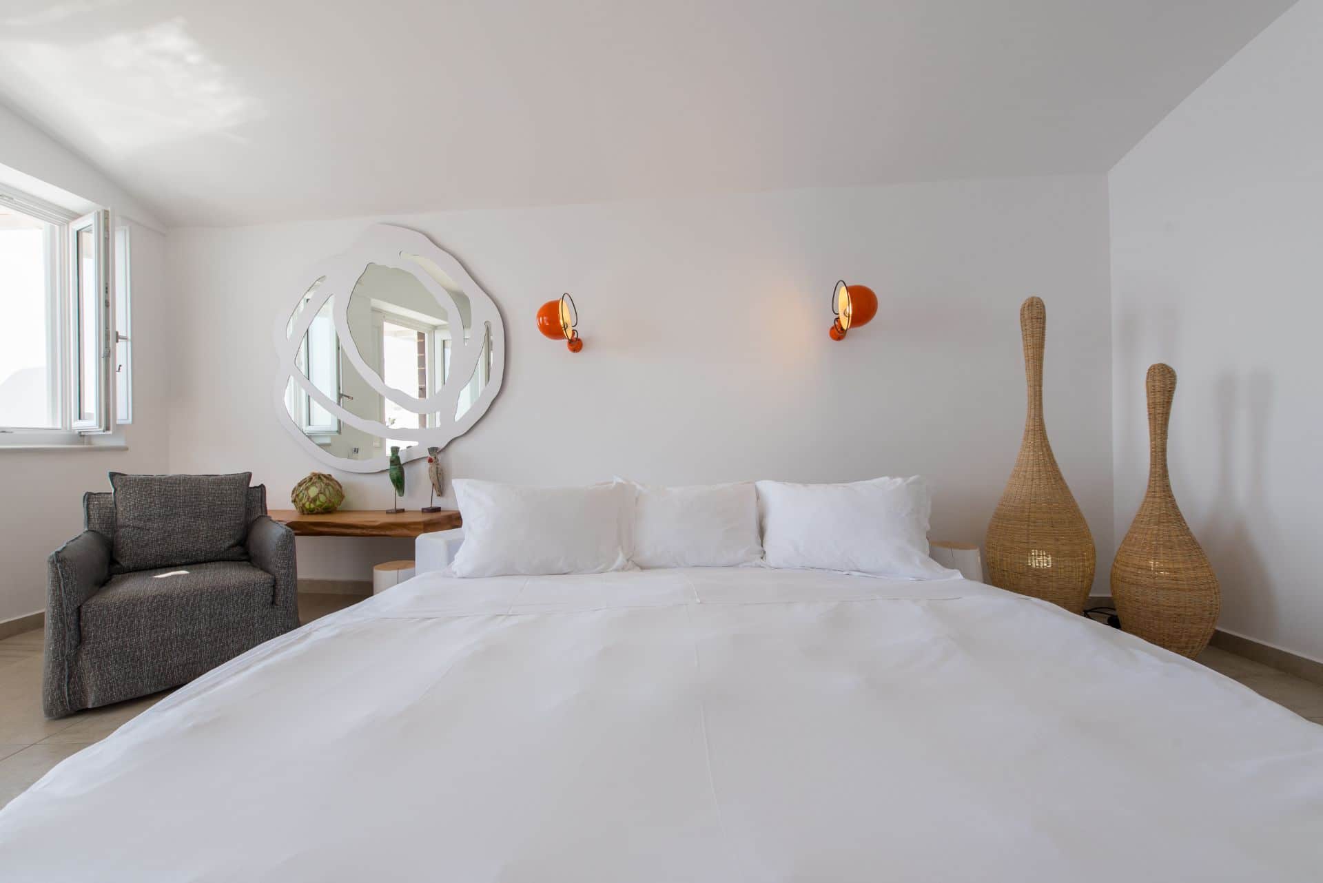 Open plan bedroom with Queen Size bed, desk and an armchair and airy bathroom with a glass cabin ShowerJet or Bath tub.